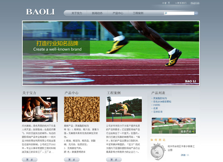 杭州寶力物資再生利用有限公司成立于2002年,專業(yè)從事體育塑膠工程材料制造及施工,產(chǎn)品專用于塑膠跑道,籃球場(chǎng),網(wǎng)球場(chǎng),幼兒園活動(dòng)中心,人造草坪,人行道和高架橋等鋪設(shè)。公司委托蒙特為其量身打造專業(yè)、特色的企業(yè)官網(wǎng)。