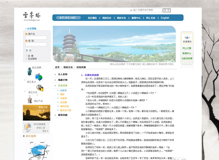 雷峰塔傳承著千年的風(fēng)雨滄桑,千年的文化情結(jié),是西湖乃至世界的文物瑰寶,因此,對它的展示不僅要體現(xiàn)豐厚的文化底蘊,體現(xiàn)精美的景觀設(shè)計,還需樹立嶄新的品牌形象,傳遞其獨特的文化韻味。在此基礎(chǔ)上,還需滿足網(wǎng)站的信息展示、訂購服務(wù)、查詢互動等平臺功能。