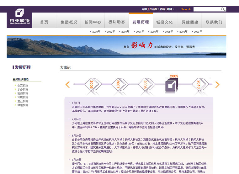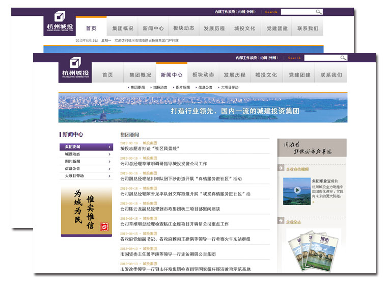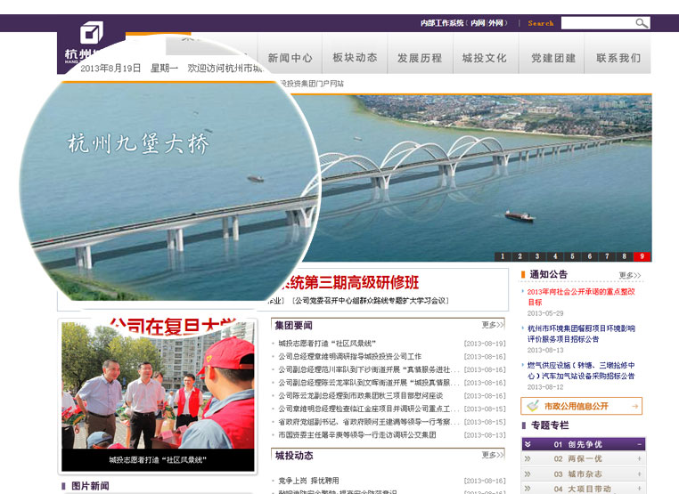 杭州市城市建設投資集團有限公司成立于2003年,直屬于杭州市人民政府,注冊資本65億元。目前集團已發(fā)展成為擁有公共交通、城市水務、城市能源、城市建設、城市環(huán)境、置業(yè)發(fā)展六大經(jīng)營板塊23家下屬企業(yè)、合并資產(chǎn)總量800多億元的巨型企業(yè)航母。?為建立良好的集團網(wǎng)絡形象,杭州城投邀請蒙特為其設計全新的網(wǎng)站建設方案。